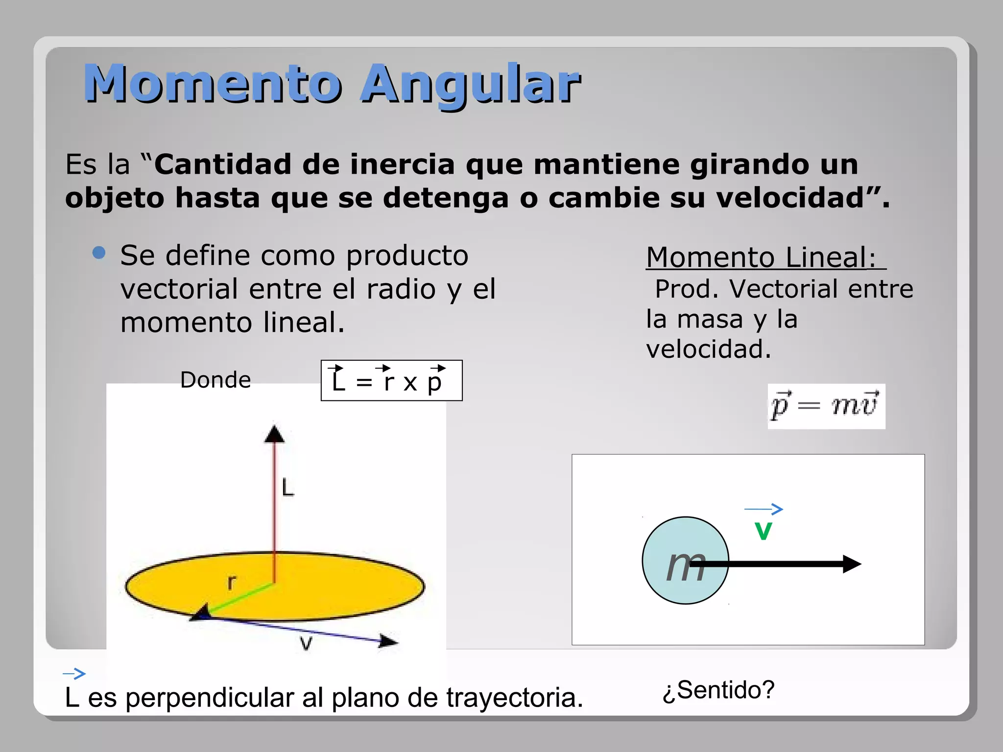 El momento angular, definido como el producto de la inercia rotacional y la velocidad angular, es una magnitud vectorial conservada en ausencia de torques externos. Este concepto es crucial en la formulación de leyes como las de Kepler para el movimiento planetario y en la mecánica cuántica para explicar la estructura atómica.